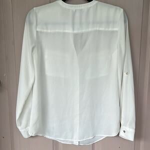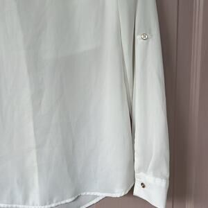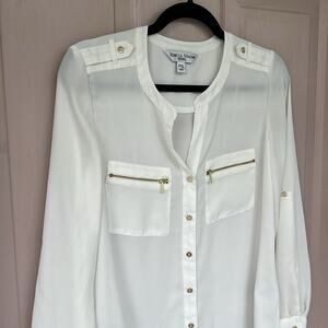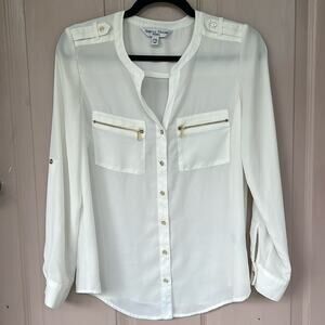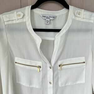 This lightweight white Rebecca Malone blouse with gold, zipper front pockets and gold buttons down the front. This blouse is lightly worn. Shoulder buckles with a gold button add a nice detail, and a ribbon in the arms allow for the arms to be folded back and clasped with a button. The size is a petite small.