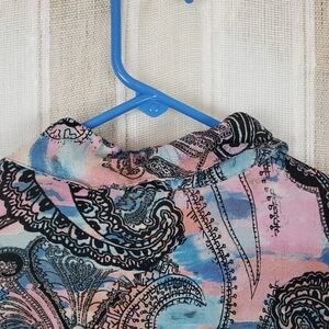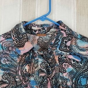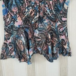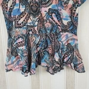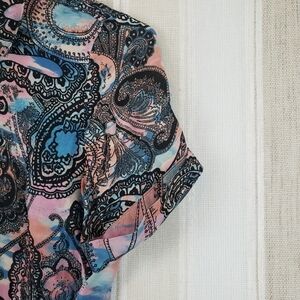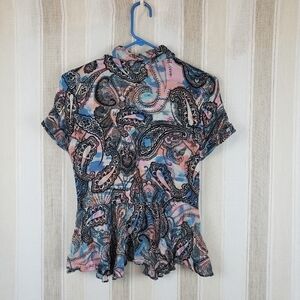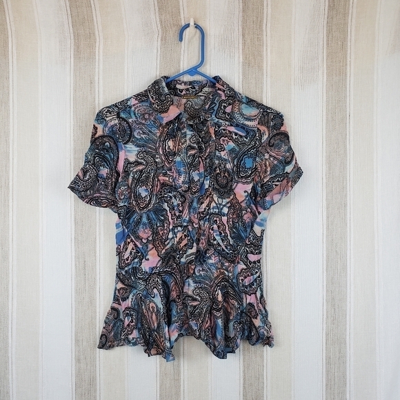 Excellent condition, short sleeved peplum style top, full button front, colorful pattern.