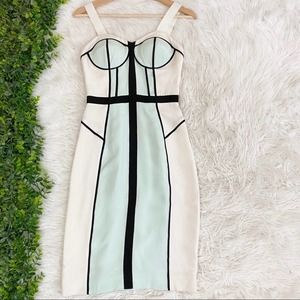 Brand is Rebecca Minkoff. Style name is Clarissa. 100% Silk color block bustier bodycon dress. Mint, black, and creamy off white color. Padded with underwire at bust area. Back zip. Has a few tiny spots, not noticeable at all and may be removable, I haven’t tried to clean, not even visible in pictures. Adjustable straps. 100% Silk, lining is 100% Silk. Lands around the knee area on most people. Same dress in different colors has been worn by many celebrities to events!