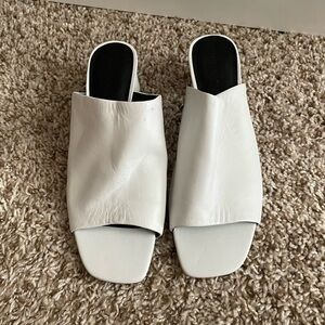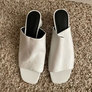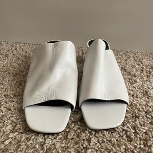 Like new pair of Aceline Leather Cylinder Heel Mule Sandals from Rebecca Minkoff in White. Size 8. These open toe mule style heels are made from a beautiful buttery white leather with a unique round heel with silver accents. A couple marks on the shoes as pictured; they are quite subtle.