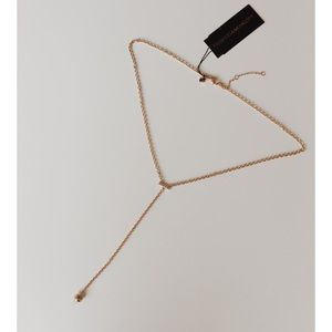 Rebecca Minkoff – Acorn Crystal Y-Necklace. BNWT. Yellow-goldtone color. 20" length. This is a Y-shaped necklace with a slender bar lined with pave crystals at the top and a cone-shaped crystal hanging at the bottom. The chain is a slender cable chain. The crystal cone is made of glass.