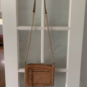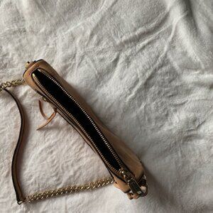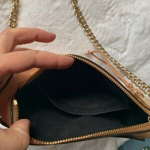 This gently used bag goes great with jeans as well as dresses. Easily fits a phone, slim wallet and keys. It has a detachable chain and leather strap (22" drop) and zippered outer pocket on the front. The interior is lined with a flat pocket.