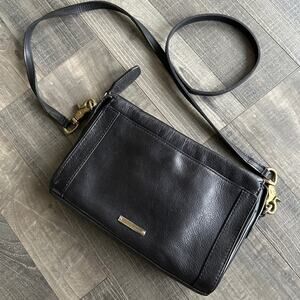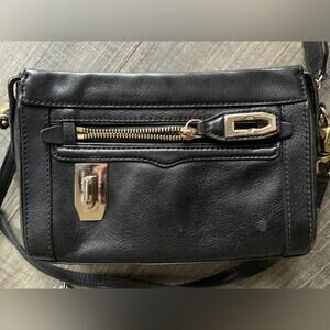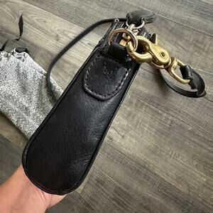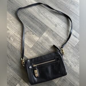 Crossbody purse with strap donning gold hardware. Please note due to wear the gold does show fading/scuffs/marks. The leather shows wear as well along with some stains inside purse. Comes with dust bag.