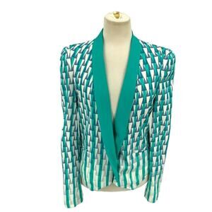 Rebecca Minkoff Becky Jacket 100% Silk Aquamarine Combo; Teal/Blue/White triangles ombre down the garment. Size Medium