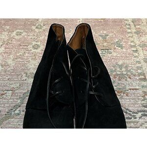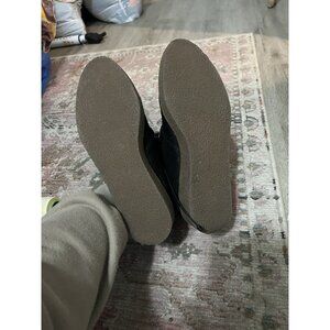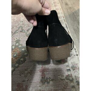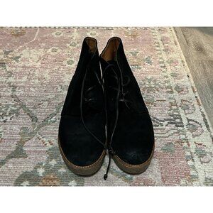 Sleek black ankle boots with lace-up design. Features a comfortable wedge sole. Perfect for versatile styling.