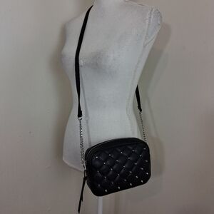 Chic black crossbody with quilted design. Silver stud accents. Stylish and versatile.