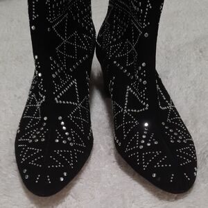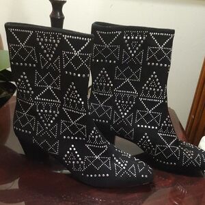 Rebecca Minkoff Hessania black suede boots with intricate silver stud patterns. Perfect for adding edge to any outfit.