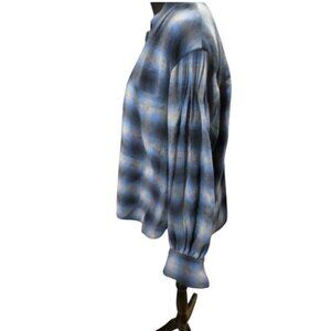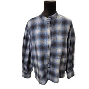 Rebecca Minkoff Blue Plaid Button-Up Mandarin Collar Pleated Sleeves Shirt Small