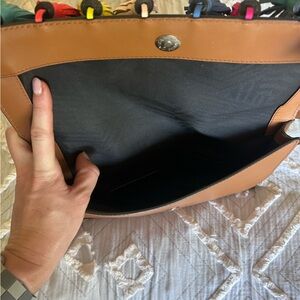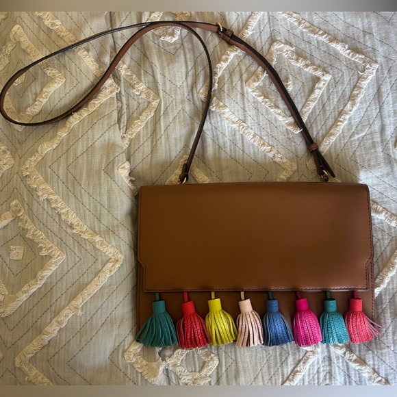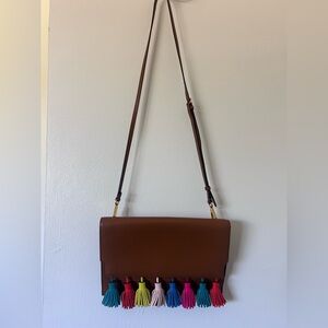 Chic brown crossbody bag with vibrant tassels. Adds flair to any look. No flaws to crossbody strap. Comes with dust bag.