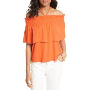 NWT Rebecca Minkoff Clementine Ghiradelle Top. Perfect for spring and beyond, this ruffled top combines a shirred off-the-shoulder neckline with slender ties that fasten behind your neck.