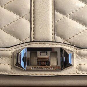 Full size bag 11" long X 6" tall. 2 in 1 Clutch or Shoulder bag/cross body. Beautiful stitched leather in light tan/cream. Great for year round use. Chain is removable with D rings on interior. Twist Lock open exterior flap pocket. Rebecca Minkoff hand bag with detachable chain strap for clutch or crossbody. Print lining in gorgeous black & white fabric with no call outs, no stains, ribs, odors. Has Inner zip pocket as well as card slots and extra pocket. Exterior back pocket for ease. Magnetic snap closure. Gently loved.