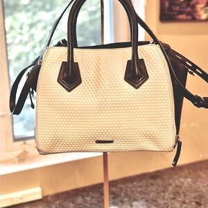 Chic satchel with cream textured body. Black accents and handles. Perfect for daily use. Lots of space - the interior has a zippered pocket on one side and two open pockets on the opposite side. The exterior has zippered sections on both sides of the bag. The satchel has a short handle for carrying the bag in your hand and a long strap for using it as a crossbody or shoulder bag. The bag shows some wear but is still in nice condition. A real bargain from a new price of $425 to used at $45.