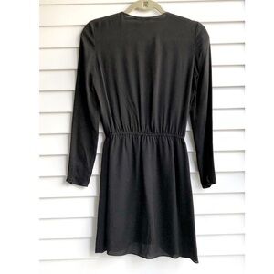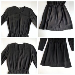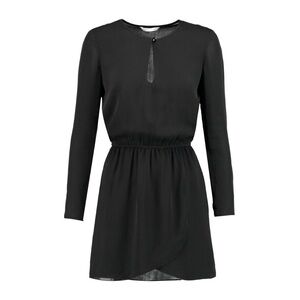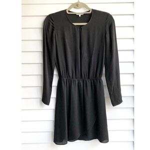 Rebecca Minkoff Cyphers Silk Keyhole Mini Dress in black. Rebecca Minkoff gives the silk dress a polished-meets-playful attitude thanks to fresh details, like a keyhole cut out front and a crossover hem. Round neck, long sleeves, button cuffs, front keyhole with button closure. 100% silk. Elasticized waist. Rounded crossover front hem. Lined. Worn but in excellent condition with no visible signs of wear. Approx. 33” long and 17.5” across from armpit to armpit.