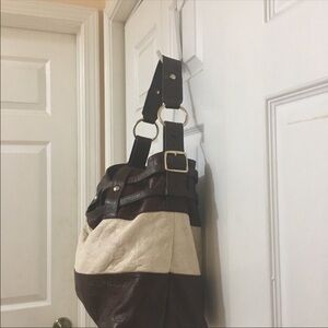 This oversized glazed, pebbled leather handbag features a buckled strap detail at the sides. Double buckled straps gather top. Metal feet. Gold hardware. Shoulder strap and magnetic-snap closure at main compartment. Lined interior features zip pocket and 2 slip pockets.