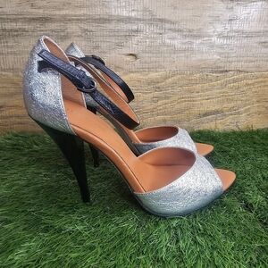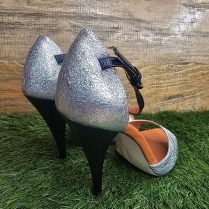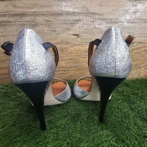 Rebecca Minkoff Ellie heel in Silver Crushed Metal. Black shiny heel with ankle strap. Great for formal occasions or a fun night out! Original box included