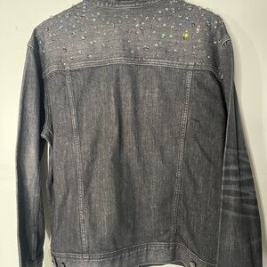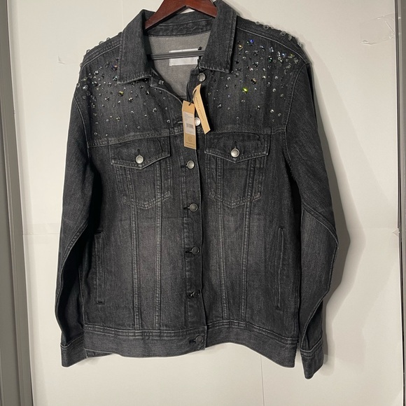 Charcoal denim jacket with sparkling embellishments. Stylish and modern look.