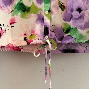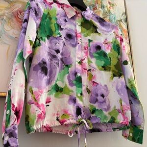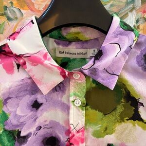 Brighten up your wardrobe with this stunning Rebecca Minkoff blouse in a watercolor-style floral print. Featuring a mix of vibrant purples, pinks, and greens, this top adds a bold and feminine touch to any outfit.