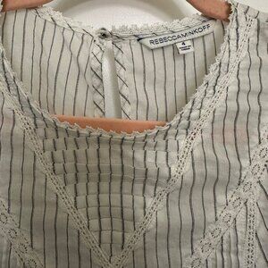 This gorgeous top from Rebecca Minkoff features a mini stripe that goes in many directions for a unique and flattering look! The flutter sleeves, lace insets, pleating and slight peplum hem make this top so dreamy! It has a button at the back neck and a zipper on the side from under the armpit all the way down to the hem. Beneath the flutter sleeves, the top comes up under the armpit, providing great coverage so you can wear a tank under this or not. The fabric is 100% cotton and lightweight like a voile. VERY pretty!