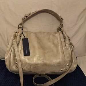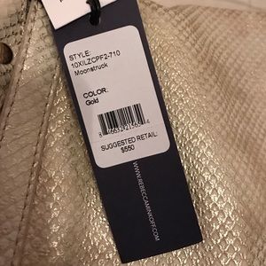 Beautiful Rebecca Minkoff Gold/Cream Metallic Shoulder Bag!!!! Brand new with tags and dust bag!!!! Studded short handle and detachable shoulder strap. No damage, scratches, tears, stains, etc. Absolutely stunning bag!!!!!! Dimensions are 15" wide x 10" high x 5" deep with a 6" drop short handle and detachable long adjustable shoulder strap
