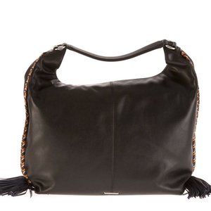 Beautiful and unique, this Rebecca Minkoff hobo leather bag has some exciting and ornate features including multi-colored side stitching with blue leather tassles on the side. Compartments inside consists of large interio, zippered compartment, plus 4 interior pockets. You will get compliments and looks everytime you "wear" this handbag. Light, versatile, FUN!