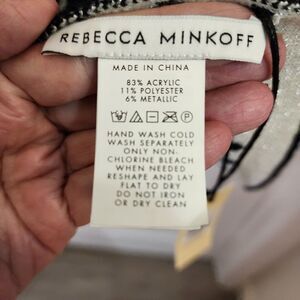 This beautiful shawl/wrap/scarf by Rebecca Minkoff is perfect for any occasion. The black and white color combination gives it a classic and timeless look, while the open hearts in opposite colors add a touch of love and elegance. The metallic thread accents make it stand out and the knit fabric type adds texture and durability.