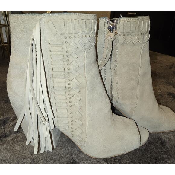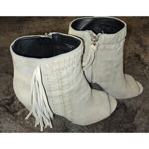 Designer Rebecca Minkoff booties size 6.5 (original retail 110)Beautiful SUPER SOFT neutral suede with leather innerSuede woven detailing with fun tassel designs. Peek a boo toe opening Zipper inside Super comfortable! can be worn as Western style. dress up or down.
