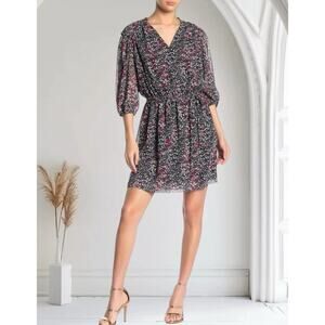 Rebecca Minkoff Isabella Ditsy 3/4 Sleeve Black Fuchsia Floral Mini Dress. The V-neckline and pullover style with an elastic waist making it easy to dress up or down for any occasion, be it travel, party, casual, workwear or business. This designer dress was $298 originally.