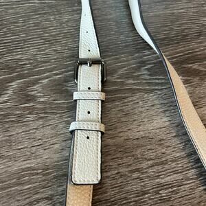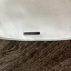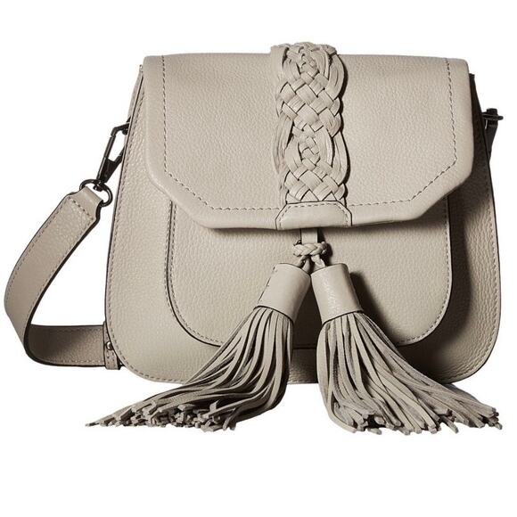 Versatile and timeless neutral color Rebecca Minkoff “Isobel” saddle bag in gray pebbled leather features braided detail with oversized tassel accents. Adjustable crossbody/shoulder strap, magnetic snap closure with spacious interior + slip pockets