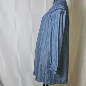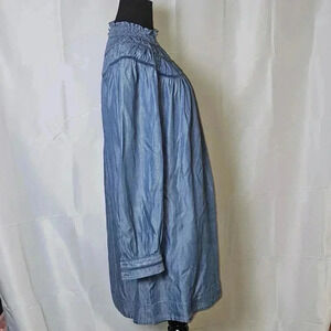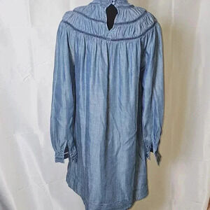Introducing the Rebecca Minkoff Jordana Blue Jean High Ruffle Collared Dress in size XS. This stylish shirt dress features a solid pattern, long sleeves, and a high neck with a pullover closure. The garment is made from Tencel denim fabric with a knee-length dress design. The dress is perfect for various occasions such as travel, holy communion, party/cocktail, and casual wear. The dress comes in a beautiful blue color and has accents of ruffles that add a touch of elegance to the overall design. The dress is suitable for women and is part of the Western, Peasant, and Preppy themes. It is recommended to dry clean only to maintain the quality of the dress.