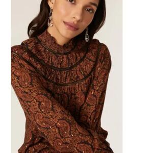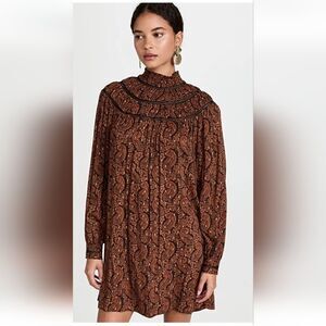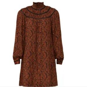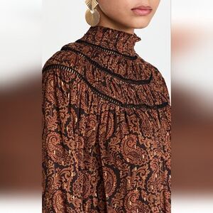 Pretty paisleys bring out the breezy boho charm of this Rebecca Minkoff dress trimmed with a ruffled smocked mock neck and gathered yoke.