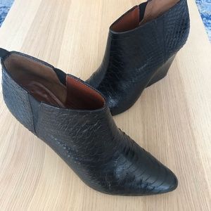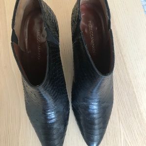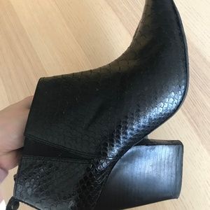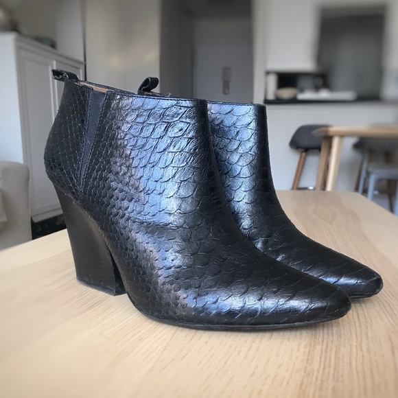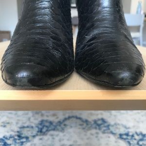 Gorgeous Rebecca Minkoff La Roux black snake print booties with cowboy-style shape.