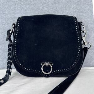 -Rebecca Minkoff -Suede saddle bag is enhanced with delicate stud and braided chain detailing -Top flap with ring closure -Outside slip pocket -Inside zip pocket -Lining: Cotton Suede and leather -Silver tone hardware -Removable, adjustable leather and chain strap, 14.5" to 22.5" drop - This bag has minimal wear and is it great condition. No noticeable stains inside or out. -The toggle has been reattached with glue. It should not come off again but can be reglued if need be. 9"H x 10.5"W x 2"D please see all pictures for condition.