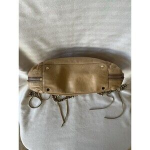 This Rebecca Minkoff shoulder bag is crafted from leather in a stylish beige color, featuring a rectangular shape with a snap closure and gold hardware accents. The bag has a chain strap that can be adjusted to wear as a crossbody, or shoulder bag making it perfect for both travel and casual occasions. With a tassel accent and zipper expander for extra storage, this chic and classy bag is designed for the modern city woman who values both style and functionality.