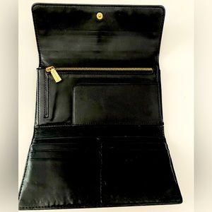 Exterior- Back Pocket to hold Receipts & Front Exterior has 6 Card Slots, Snap Closure, Goldtone Stud Accents & Logo