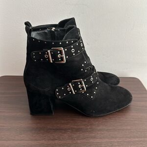 Rebecca Minkoff Logan Studded Black Suede Double Buckle Ankle Boots with Block Heel.