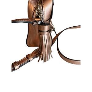 Rebecca Minkoff MAB Camera Bag in Metallic Rose Gold. Excellent preowned condition, used once. Camera case style with iconic hardware in silver, zippered top, chunky tassel detail and crossbody strap. Clean black fabric interior. Small mark on bottom of bag - see pic