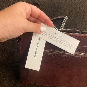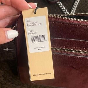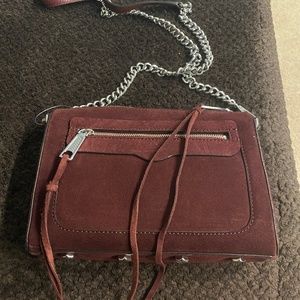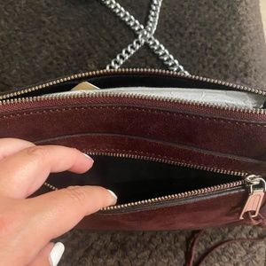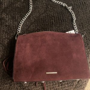This bag is beautiful! It’s a gorgeous black cherry super soft suede color… Rebecca Minkoff makes the best cross body bags hands down and this one is special!