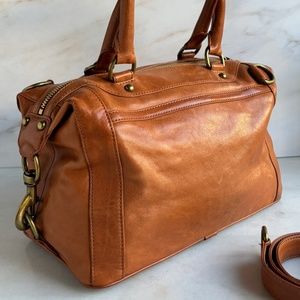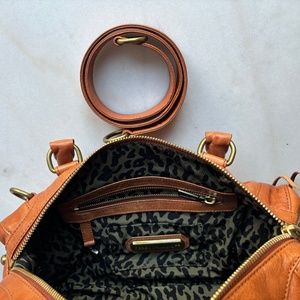 Rebecca Minkoff MAB in Luggage with Antique brass hardware with detachable strap. Buttery soft leather and beautiful rich color. Some creasing from storage, tarnishing brass hardware and some thin scratches on leather. Clean inside. Smoke free, pet free home. Dust bag and tags included. 12/ 1/2in w x 7in deep x 8in tall .