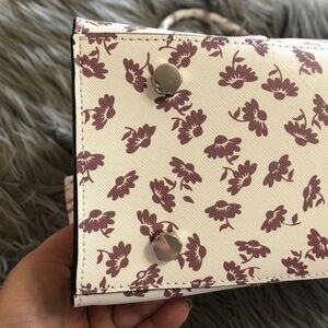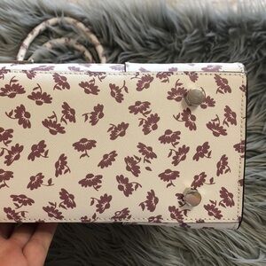 Magnetic snap closure. Exterior zip pocket. Interior zip, wall and cell phone pockets. Protective metal feet. Lined. Saffiano leather. Silver hardware.