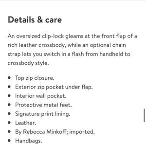 The first photo is from the Rebecca Minkoff website for reference. All other photos show the actual bag for sale.