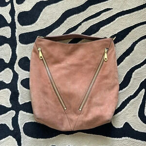 Rare Rebecca Minkoff Moto bag in beautiful brown / tan suede with gold studded strap & black interior. 2 outer zip pockets, inner slip pockets & zip pocket, top snap closure. Great condition.