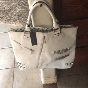 This Moto Tote has studs & zippers to add edge to any outfit. 15"W c 14"H x 3.5"D, genuine leather, silver hardware, 5" handle drop, 2 exterior pockets,top zipper closure, 1 interior zip pocket, 2 interior slip pockets, matching dust bag.