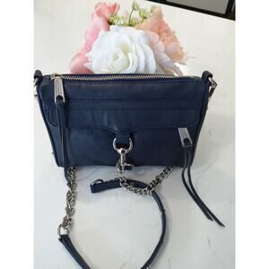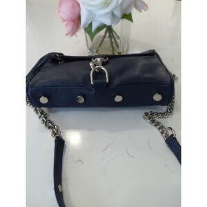 Rebecca Minkoff. Leather Mini Crossbody. Navy with stand out silver embellishments and hardware. Outside hook latch. Strap is juxtaposition from chain to leather, in good condition with silver studding. Has 2 tassle charms, zipper closure at top. Storage pockets. The entire purse is in good condition. Inside has minor discoloration at top by zipper. Not noticeable when opening. Truly a chic and bold statement piece. See photos for condition