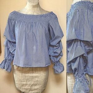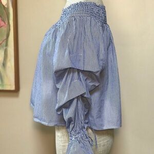 Rebecca Minkoff off the shoulder Bardot shirt in blue with white pin stripes. Ruched, Ruffle long sleeves with dainty bow at the ruffle cuffs. Smocked, thick-banded neckline to wear off the shoulder. Oversized blouse. Cotton. So cute and elegant!