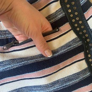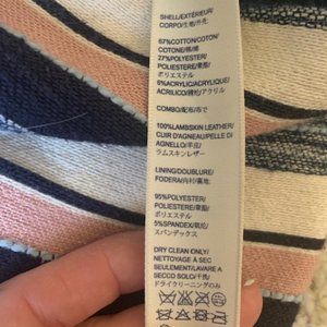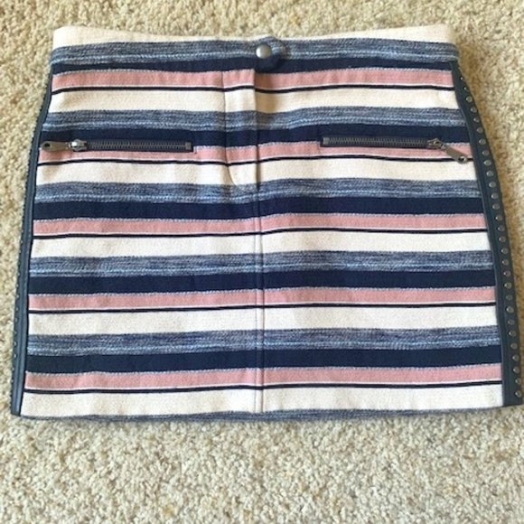 This fun, summery, striped mini skirt is a sturdy made piece with a heavy cotton & polyester blend, lined well with acrylic and trimed on the side with lambskin and metal buttons for decor. Two deep pockets are in the front of the skirt, each have zipper closures. A hidden zipper also is in front, under a hidden metal button to keep it fastened.This beautiful, dry clean only, size 2 skirt will get you lots of compliments. Perfect condition.