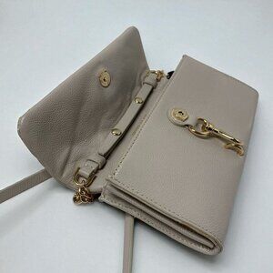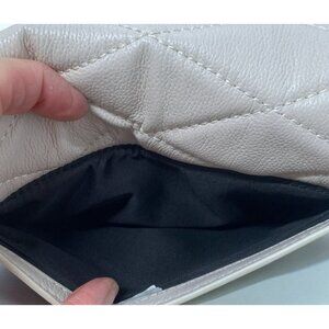 The convertible, Edie crossbody bag by Rebecca Minkoff features a quilted beige leather design, gold-tone hardware, and a compact fabric lined interior. The removable chain strap allows the bag to easily convert from daytime crossbody to evening clutch. Excellent preowned condition, with no visible flaws.
