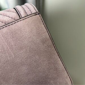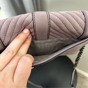 Beautiful light purple quilted bag. Black/cobalt hardware. Minor wear from clasping in front. Adjustable strap. Original tags unattached and dust bag. Great condition!