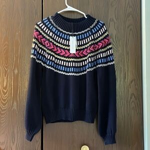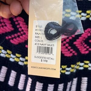 Rebecca Minkoff navy blue sweater with multi-colored design on the front and back. Light blue, pink, yellow, magenta and white. Heavyweight knit. Size Large. NWT.