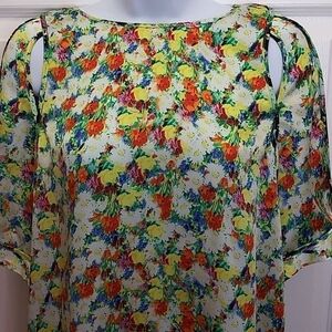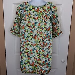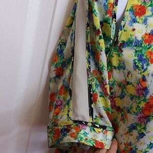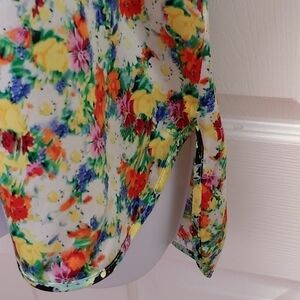 EUC 100% silk top with front and back cut out slits, vibrant floral print, cream colored strips down sleeves, and hi-low hem.