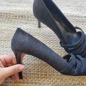 Rebecca Minkoff Snake Print Leather Suede Crisscross Studded Heels.